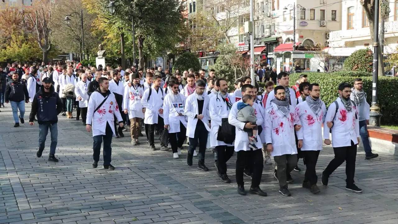 Doktorlar adın abasın açıklamasını okuyan Murat Can Çelik, "İşgalci israil tarafından, Filistin'e karşı yapılan saldırılar, 7 Ekim'de şiddetlenen çatışmalar ile yeni bir katliama dönüşmüştür. Bombardımanda tüm savaş kuralları ihlal edilerek hastaneler, okullar ve hatta Birleşmiş Milletlerin sığınakları dahi vurulmuş, 26 hastane, 55 sağlık merkezi yerle bir edilmiş, 5 binden fazlası çocuk olmak üzere 13 binin üzerinde sivil acımasızca katledilmiştir. Bunun üzerine yapılan kara harekâtları ile hastanedeki sivil ve çocuklar dahi öldürülmüş. Elektrik, internet ve suyun kesildiği Gazze’de bebekler kuvöze oksijen sağlanamadığı için vefat etmiştir. Hastaneler, hastalar, doktorlar ve sağlık çalışanları gibi en insani unsurlar bile saldırı altındayken, işte biz hekimlere, sağlıkçılara büyük sorumluluk düşmektedir." dedi.
