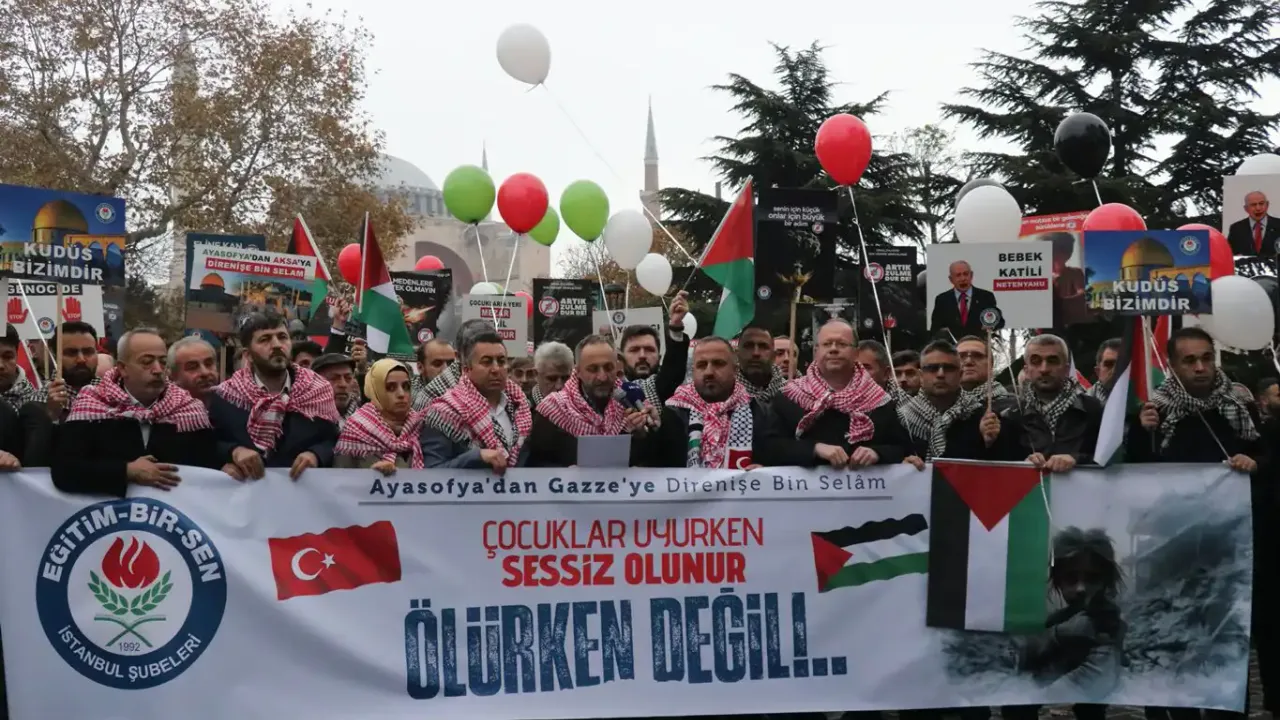 lanetleyen, Filistin, Gazze ve HAMAS'ı destekleyen pankartların taşındığı basın