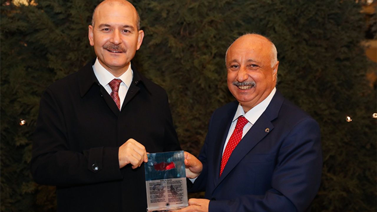 İyi dilek ve temennilerin dile getirildiği ziyarette İçişleri Bakanı Süleyman Soylu’ya Batman Üniversitesi plaketini takdim eden Rektör Durmuş, Batman Üniversitesi Paketi’nin üzerinde Türkiye Cumhuriyeti haritası içinde Türk Bayrağı’nı temsil eden ay ve yıldızın; kelime-i tevhid şeklinde hat sanatı ile yazıldığını, Türkiye haritasının sağında Allah (c.c.) ismi azamınım, sol tarafında ise son peygamberimiz Hz. Muhammed (s.a.v) isminin yazıldığını, haritanın etrafında Allah azim-üşşan’ın 99 isminin yer aldığını ve “Korkma yeise düşme Esma-ül Hüsna ile korunur bu vatan toprakları asla parçalanmaz, peygamber efendimizin övgüsüne mazhar olmuş bu muzaffer millet asla ayrılmaz” ifadesinin yazılı olduğunu, haritanın altında ise Türkiye Cumhuriyeti’nin bağımsızlık nişanı İstiklal Marşı’nın yer aldığını belirtti. HABER MERKEZİ