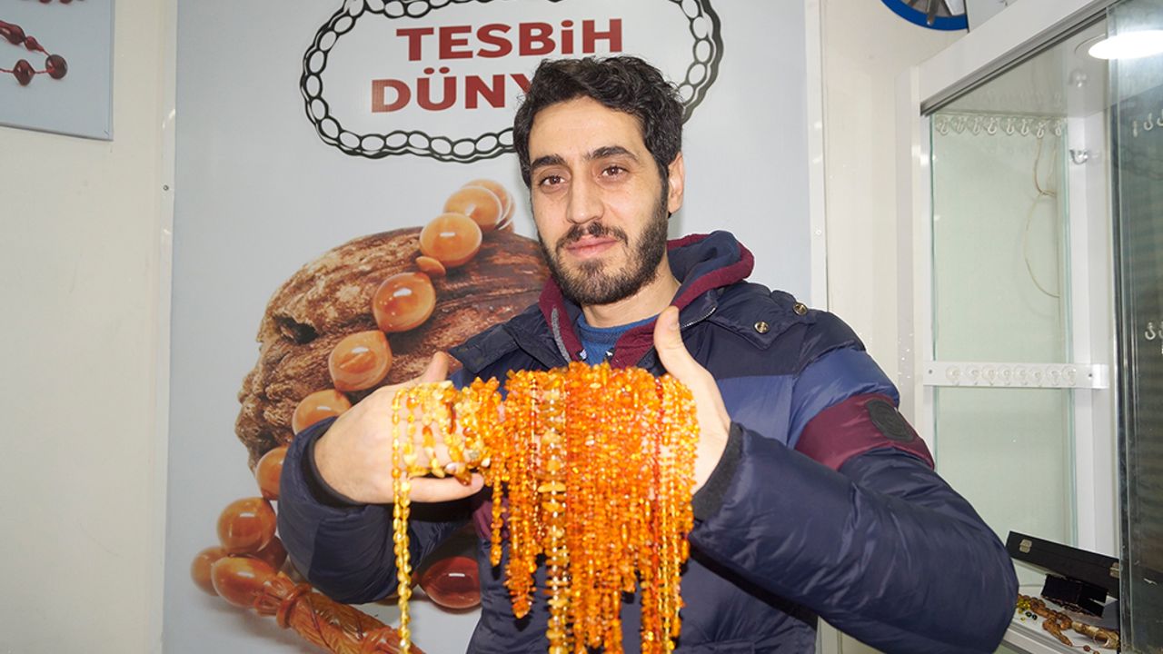 Damla kehribarın nasıl oluştuğu hakkında açıklamalarda bulunan Ahmetoğlu, “Damla kehribar fosilleşmiş reçineden meydana gelir. Yani ağacın reçinesi dışa vurur ve uzun yılar toprak altında kaldıktan sonra bu hali alır. Damla kehribar asıl Ukrayna’da ve bazı belli başlı ülkelerde bulunur. En çok ilgi gören damla kehribardır, çünkü içerisinde hiçbir kimyasal barındırmaz. Bu yüzden aileler damla kehribarı bebekleri için uygun görüyor. Bileklik, kolye yapıp bebeklere takıyorlar.” İfadelerini kulandı.