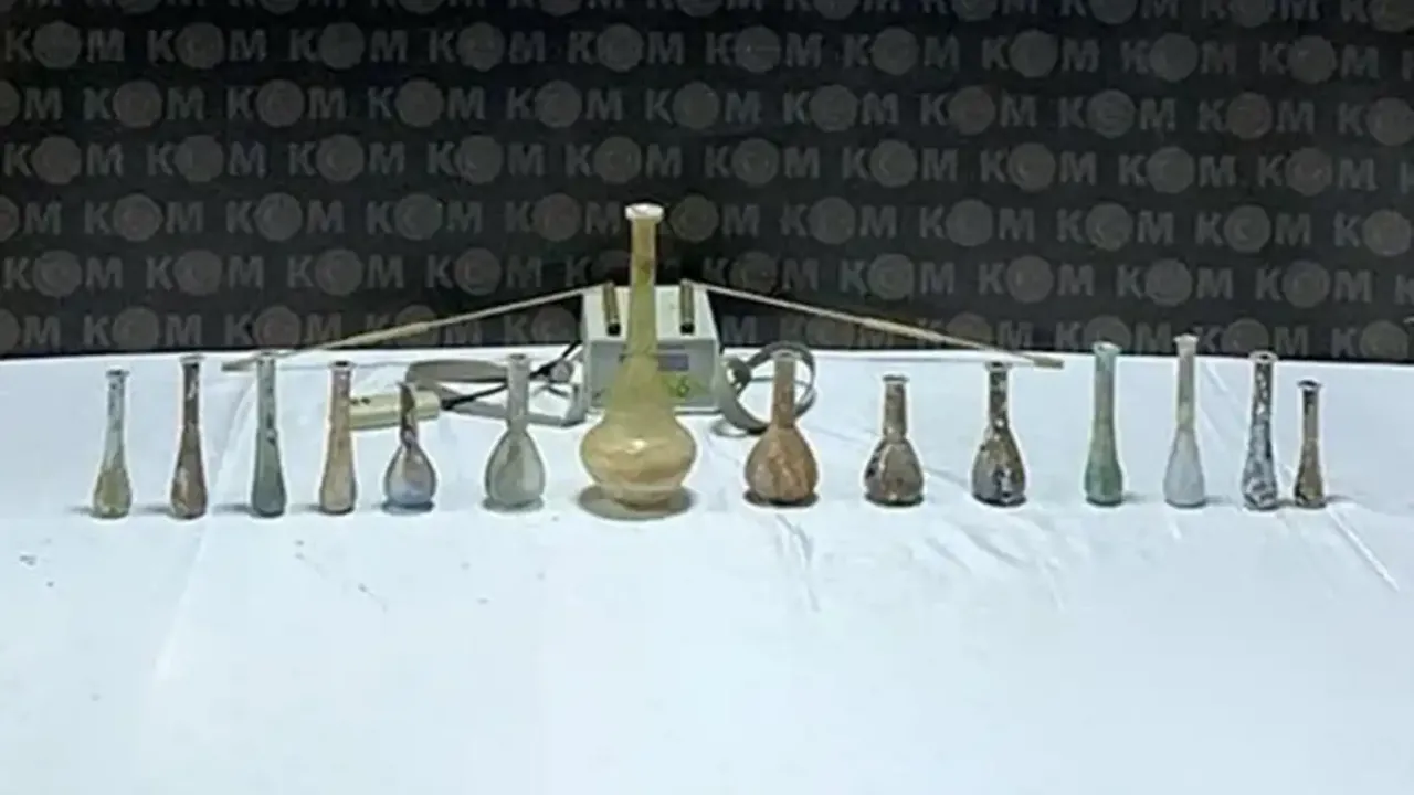 Ekipler aramada Roma dönemine ait olduğu öğrenilen 14 cam gözyaşı şişesi ve 3 define arama cihazı buldu.
