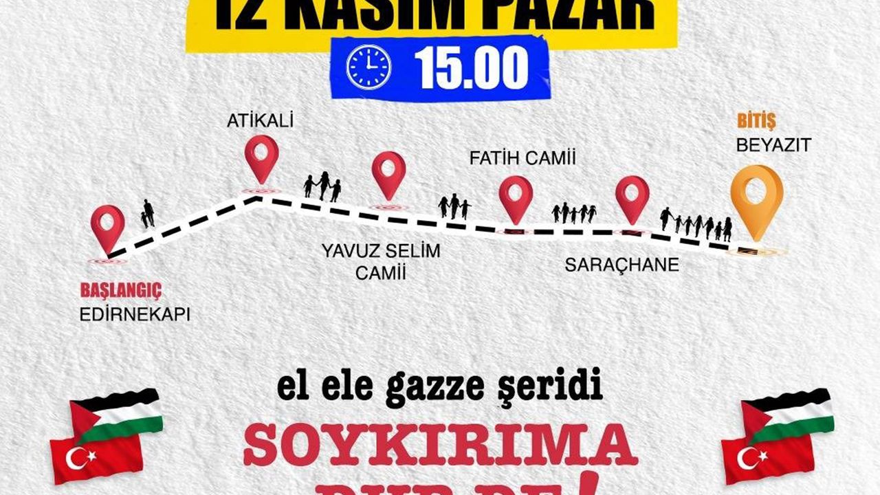 İstanbul’daki programda Edirnekapı’dan Beyazıt’a kadar bir insan zinciri oluşturulacak. El ele tutuşacak binlerce kişi, Gazze’deki direnişe desteklerini gönderecek, siyonist işgalcilerin zulmünü telin edecek. Başkent Ankara’daki insan zinciri ise Ulus’taki Melike Hatun Camii’nin avlusundan başlayacak. Kocaeli’de ise bir araya gelecek binlerce vicdanlı yürek, Fevziye Camii’nden Mobesko Köprüsü’ne kadar Gazze Şeridi oluşturacak.