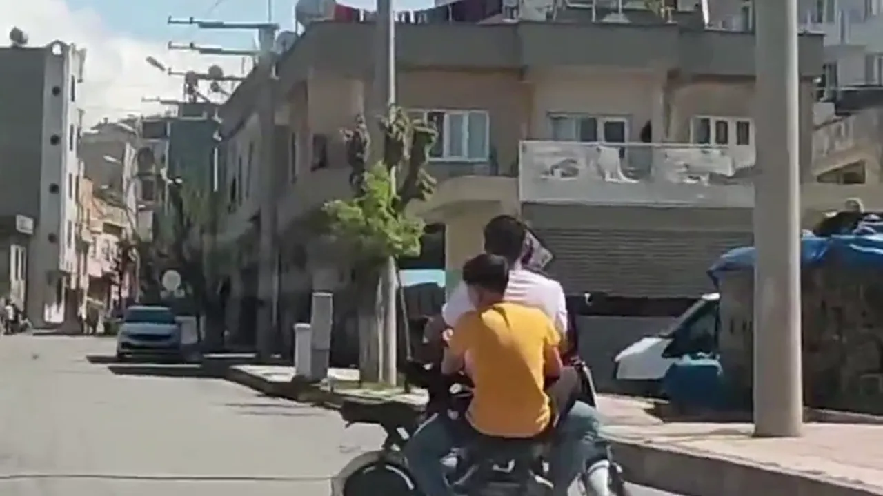 Barış Mahallesi Süreyya Öner Caddesi'nde kaydedilen görüntülerde, elektrikli bisikletle seyir halindeki iki kişi, aralarına aldıkları başka bir elektrikli bisikleti taşıdı.