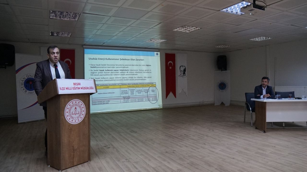 Enerji Koordinasyon Merkezi Yöneticileri Prof. Dr. Ömer Faruk Ertuğrul ve Doç. Dr. Mehmet Rıda Tür’ ün koordinasyonları ile düzenlenen “Enerji Verimliliği ve Tasarrufunun Önemi” adlı konferans Beşiri Cumhuriyet Ortaokulu Konferans Salonunda gerçekleşti.