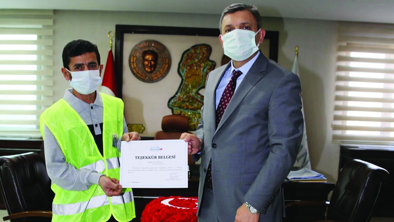 Bulunan meblağın küçüğü veya büyüğü olmadığını önemli olan sergilenen davranışın olduğunu, tüm kesimden aynı duyarlılığı beklediğini ifade eden Vali Hulusi Şahin, Belediye Başkan Yardımcısı Adnan Yürük ve Belediye Temizlik İşleri Müdürü Cengiz Gümüş ile birlikte Belediye Personeli Enver Bölek’i makamında kabul ederek Bölek’i teşekkür belgesi ile onurlandırdı.