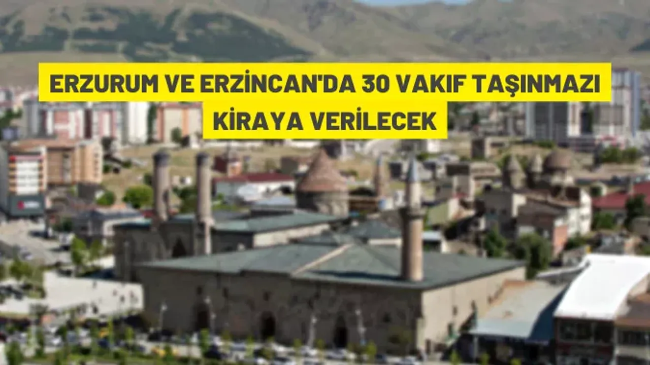 Erzurum Vakıflar Bölge Müdürlüğü, Erzurum ve Erzincan'da bulunan 30 Vakıf taşınmazını, 2886 Sayılı Devlet İhale Kanunu'nun 35. maddesinin (c) fıkrası ve 45. maddesi gereğince açık teklif usulü ile kiraya verilecek.