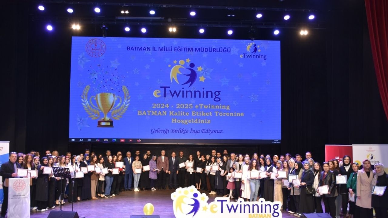 Batman genelinde eTwinning projeleriyle Türkiye genelinde ilk üçe giren öğretmen ve yöneticilere “eTwinning 2025 Kalite Etiketi Ödülleri”, Necat Nasıroğlu Külliyesi Hatice Nasıroğlu Konferans Salonu’nda gerçekleştirilen programla takdim edildi.