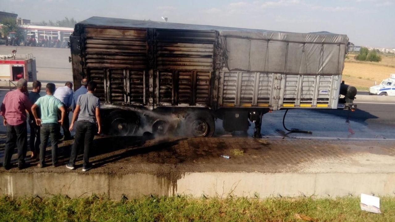 Diyarbakır istikametinden, Bismil'e doğru yol alan sürücüsünün ismi öğrenilmeyen 21TJ509 plakalı kamyonun balataları aşırı ısınınca kamyonun dorsesinde yangına sebep oldu.