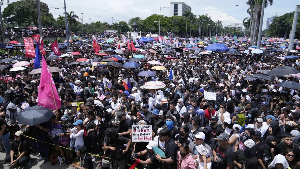 Filipinler'de sel kontrol projeleri için ayrılan bütçelerdeki usulsüzlük iddialarıyla ilgili yolsuzluk soruşturması sürerken, on binlerce kişi başent Manila'da protesto gösterisi düzenledi.
