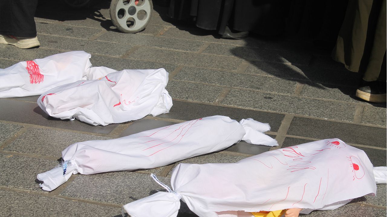 ellerinde kefene sarılmış oyuncak bebekler ve Filistin bayraklarını taşıyan çok