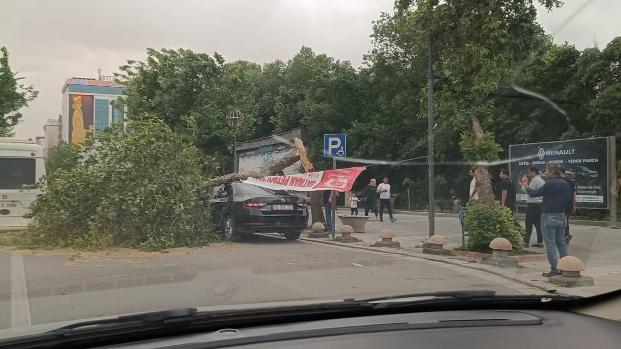 Edinilen bilgilere göre, bulvar üzerinde bulunan büyük bir ağaç, fırtınanın şiddetli rüzgarına dayanamayarak gövdesinin ortasından kırıldı. Kontrolsüz bir şekilde devrilen ağaç, o sırada yol kenarında park halinde bulunan bir otomobilin üzerine düştü.