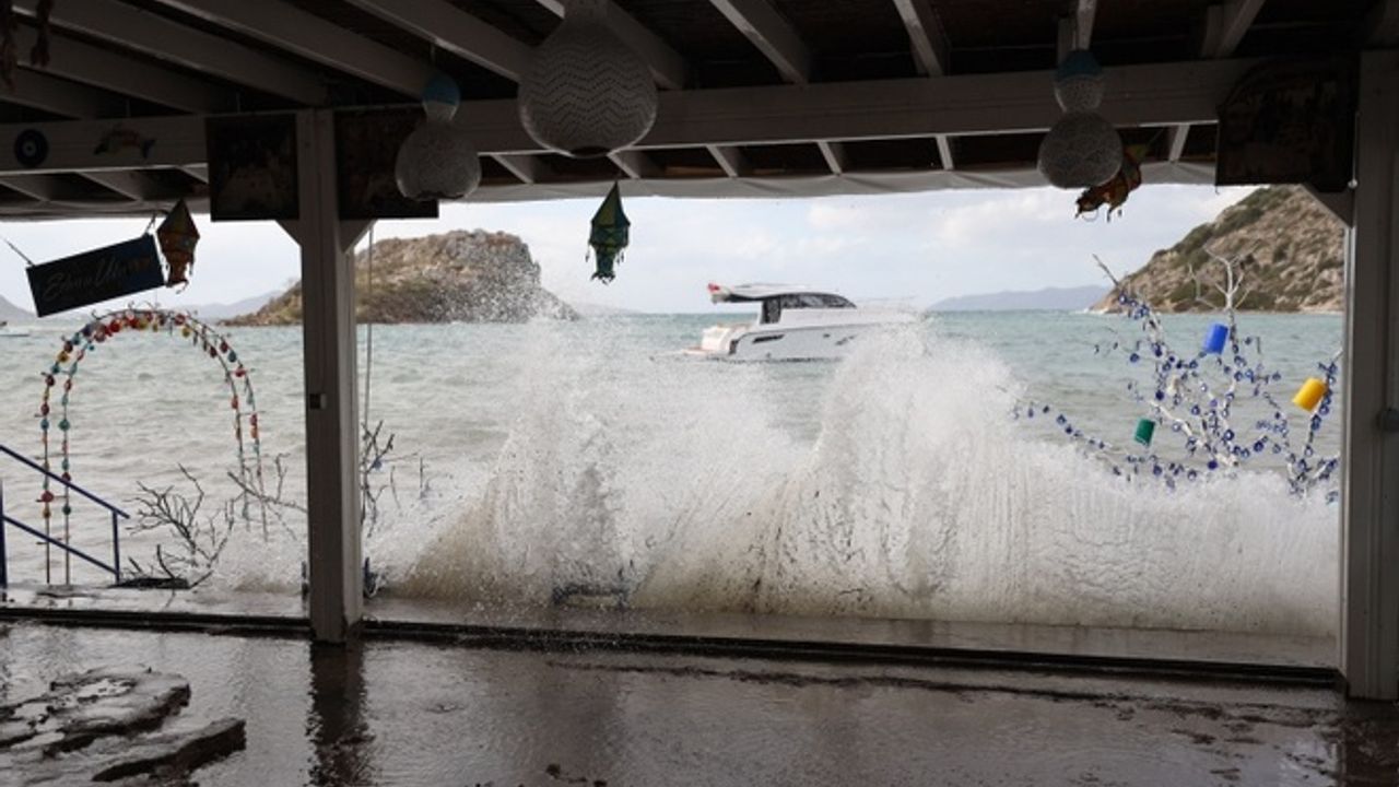 Bodrum ilçesinde fırtına ve sağanak, Ortakent Mahallesi'nde limandaki bir sürat botu ve yelkenli tekneyi batırdı.