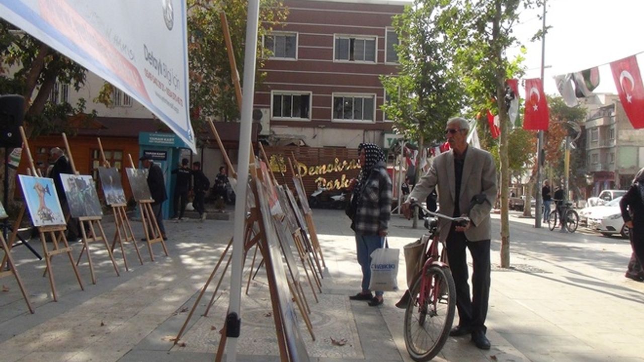 Adıyaman Halk Kütüphanesi yanında kurulan "Gazze Destek Çadırı ve Resim Sergisi"