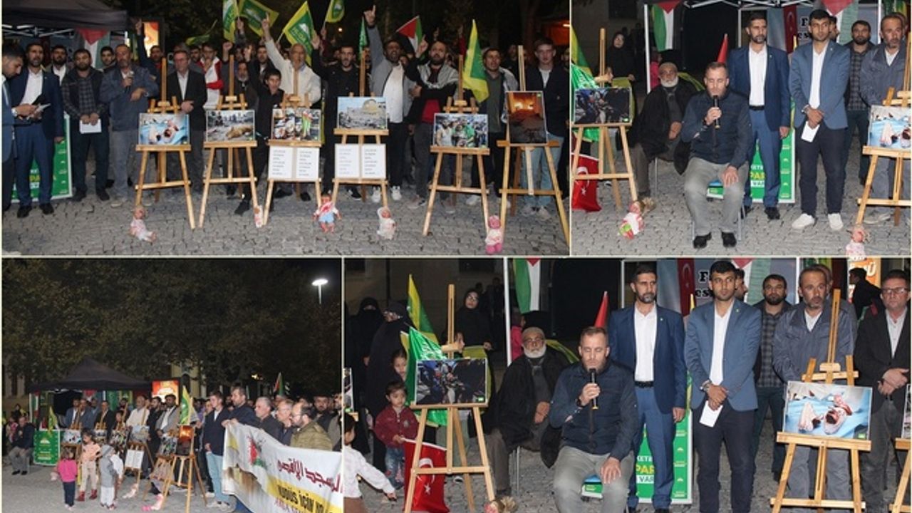 HÜDA PAR Meram İlçe Başkanı Yılmaz, şu ifadeleri kullandı: " Filistin 1917 yılında İngiltere tarafından işgal edildi. Daha sonra işgalci siyonistler tarafından toplu katliamlar, sürgünlerle ve alıkoymalarla Filistinli kardeşlerimizin toprakları işgal edildi. 1948 yılında işgalci siyonist terör örgütü işgal ettikleri Filistin topraklarında devlet olduklarını ilan ettiler.