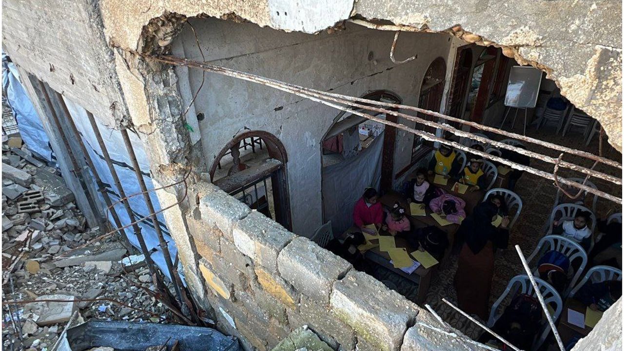 Han Yunus’ta hayata geçirilen bir okul ise, bu yıkımın ortasında umut olmaya çalışan örneklerden biri. Bölgedeki okulların bombalanarak kullanılamaz hale gelmesinin ardından, yıkılmış bir aile binası sınıfa dönüştürüldü.