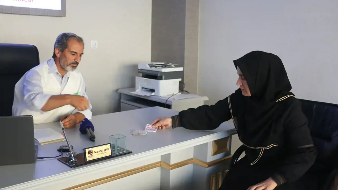 Şanlıurfa'da Esma Göv, Filistin ve Gazze'de yaşananlar nedeniyle küpelerini ve bir miktar para bağışlamak için Umut Kervanı Şanlıurfa Şubesine geldi.