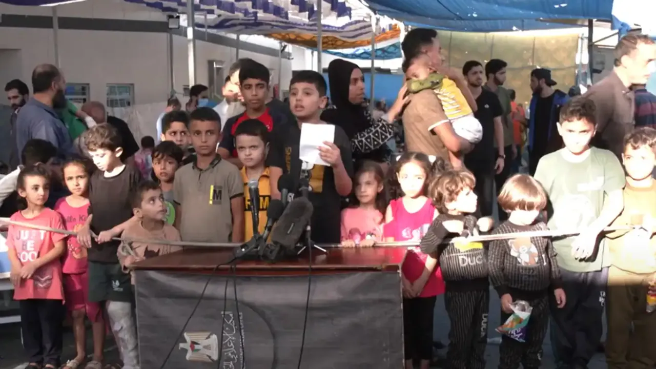 Gazze'de yerinden edilmiş ailelerin çocukları, sığındıkları Şifa Hastanesi'nde bir basın açıklaması yaptı.