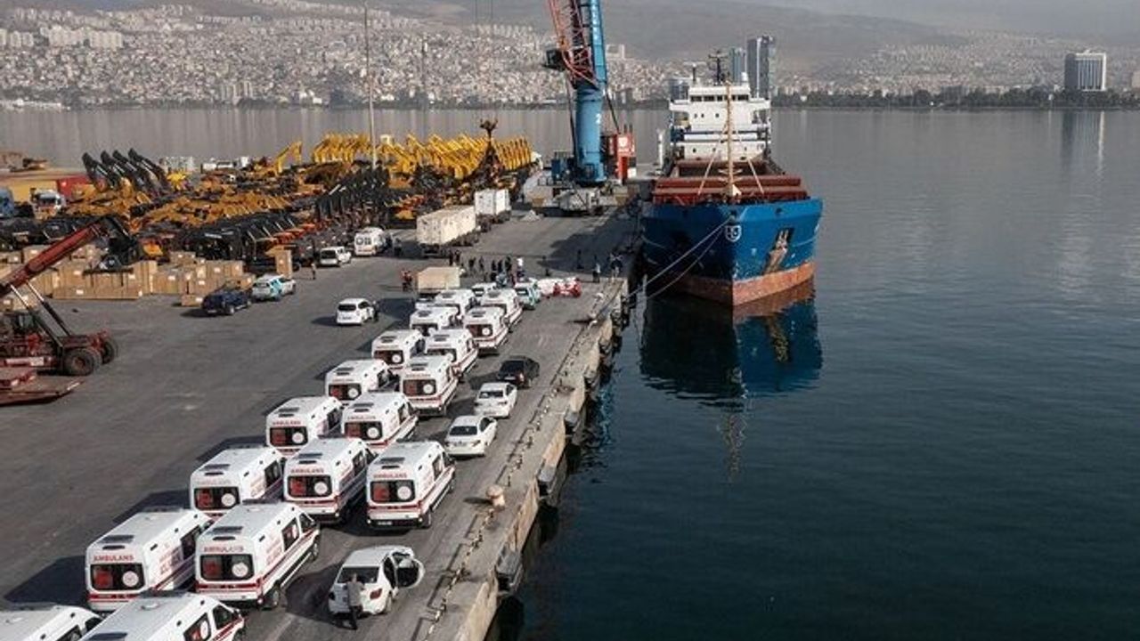 İzmir Alsancak Limanı'na önceki gece demirleyen kuru yük gemisine, görevlilerce tıbbi malzemeler ve ambulanslar yüklendi.