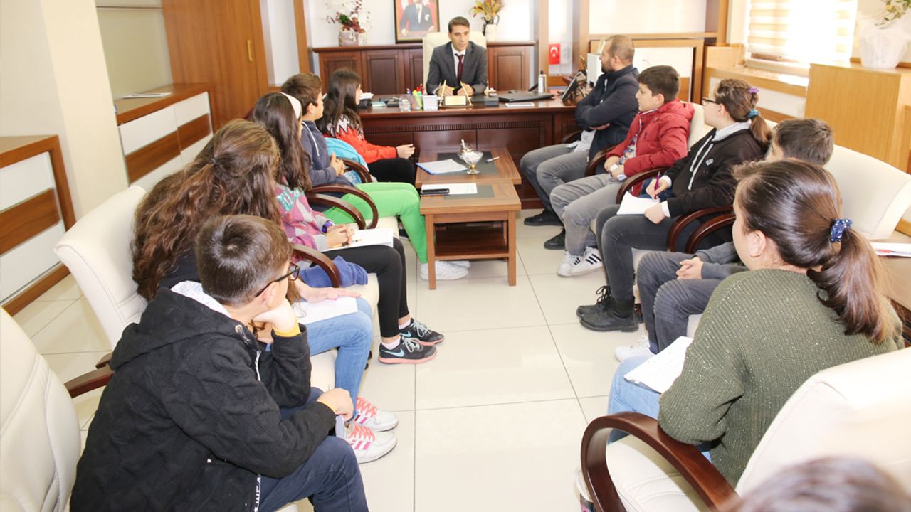 Sınıf öğrencileri ve öğretmenleri Metin Yaman ile birlikte Belediye Başkan