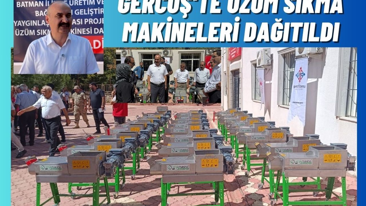 Batman'ın Gercüş ilçesinde GAP Bölge Kalkınma İdaresi Başkanlığı ve Batman İl Tarım ve Orman Müdürlüğü iş birliğiyle düzenlenen proje çerçevesinde Gercüşlü çiftçilere 40 adet üzüm sıkma makinesi dağıtımı yapıldı.