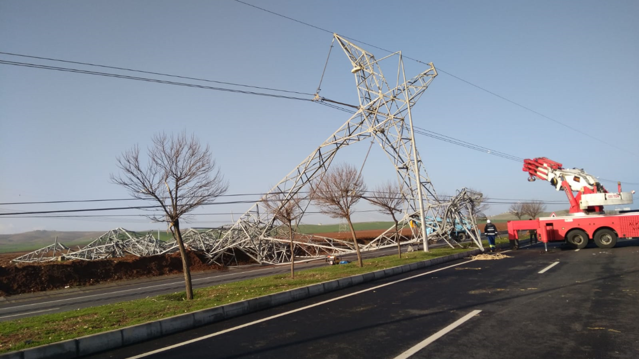 şiddetini artıran rüzgâr nedeniyle yüksek gerilim hattı direği devrildi, yol