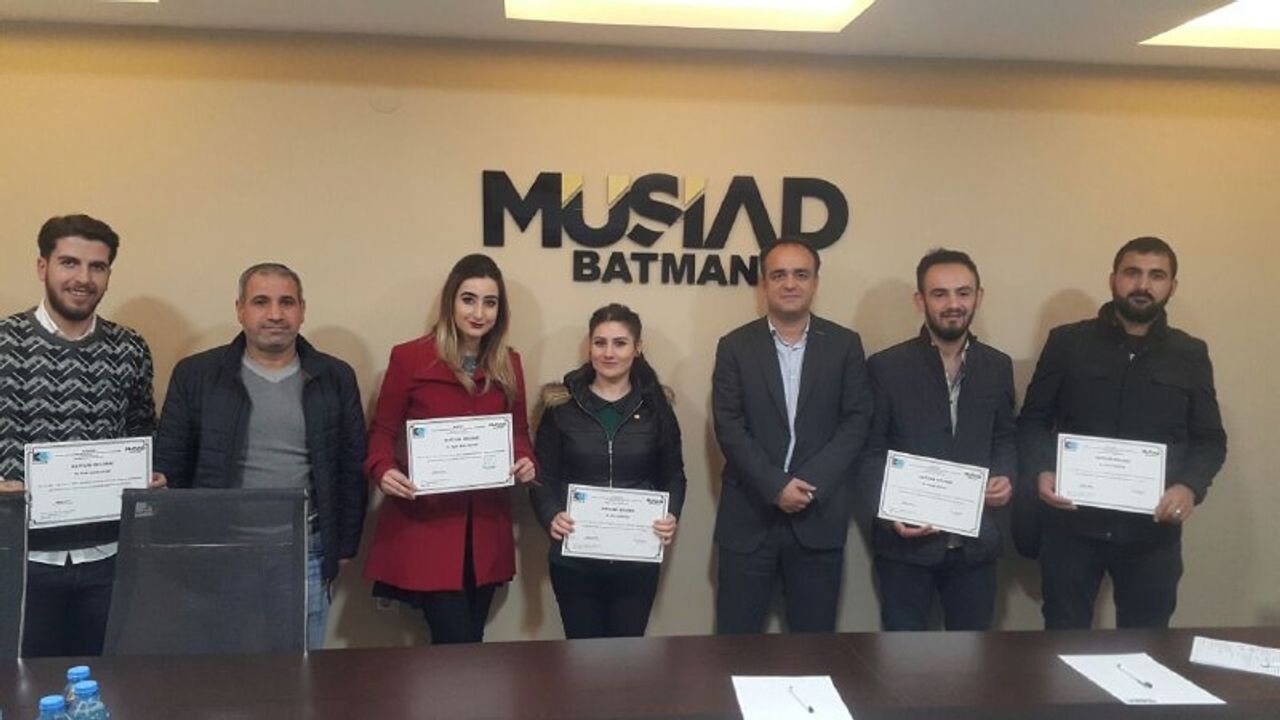 MÜSİAD toplantı salonunda düzenlenen sertifika töreninde, MÜSİAD Batman Başkanı Suad Özdemir, yönetim kurulu üyeleri ve kursiyerler katıldı. KOSGEB'in önemli desteklerde bulunduğunu, destek verdikleri girişimcilerin işlerini büyütmekle kalmayıp, istihdamın artırılmasına da büyük katkılarda bulunduklarını belirten MÜSİAD başkanı Başkanı Suad Özdemir KOSGEB'in 50 bin lira destek 100 bin liralık da faizsiz kredi desteği verdiğini bu imkanların yeni iş kuracak girişimcilere çok yarar sağlayacağını bildirdi. İlhan Yıldız