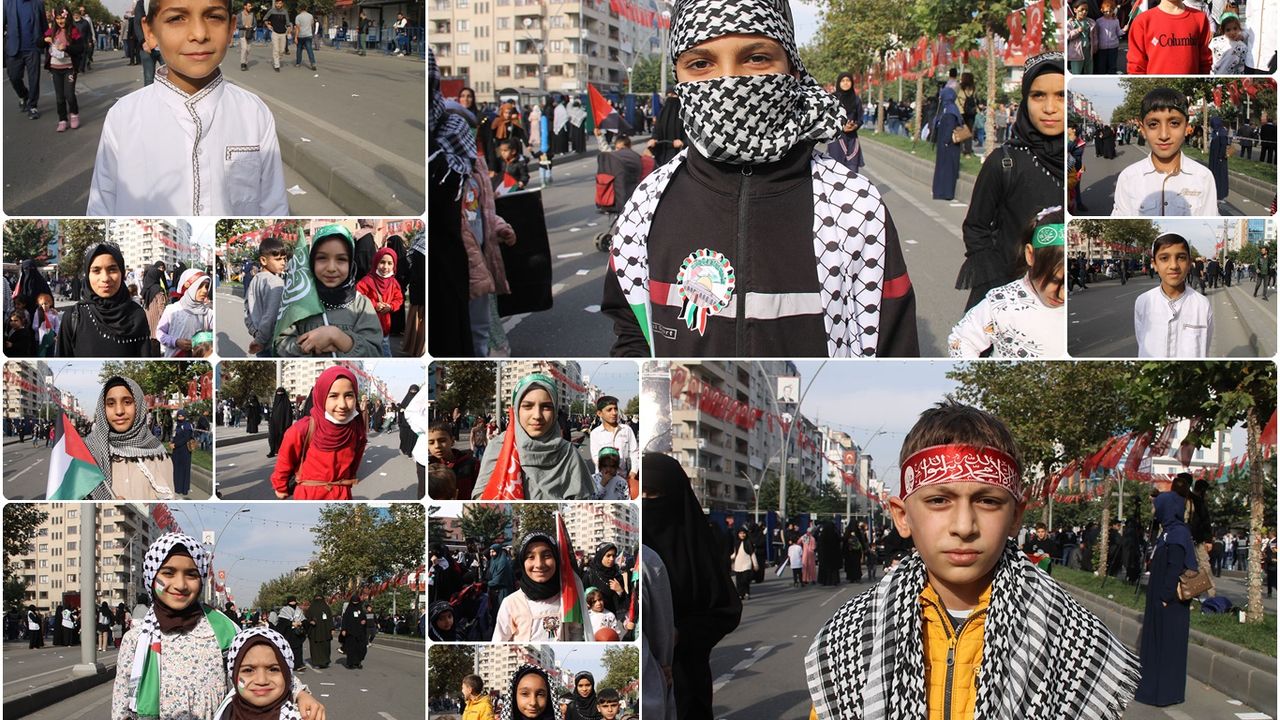 İşgalci siyonist rejim tarafından Gazze'de işlenen katliamların sona ermesi için HÜDA PAR Batman İl Başkanlığı tarafından düzenlenen "Aksa Tufanı'na Destek" mitingine katılan çocuklar, artık Gazzeli çocukların ölmesini istemediklerini belirtti.