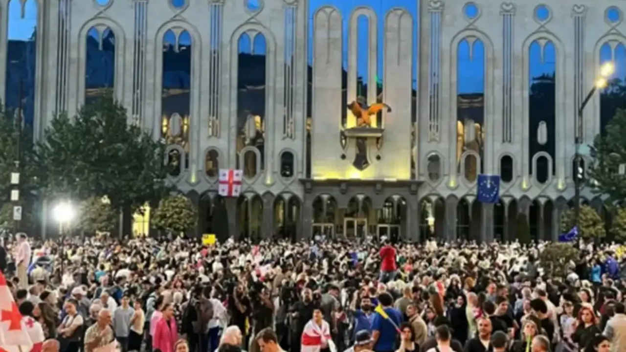Başkent Tiflis'te Özgürlük Meydanı'nda toplanan göstericiler, parlamento tarafından 14 Mayıs'ta kabul edilen ama ardından Cumhurbaşkanı Salome Zurabişvili'nin veto ettiği "yabancı etkinin şeffaflığı" yasasını protesto etti.