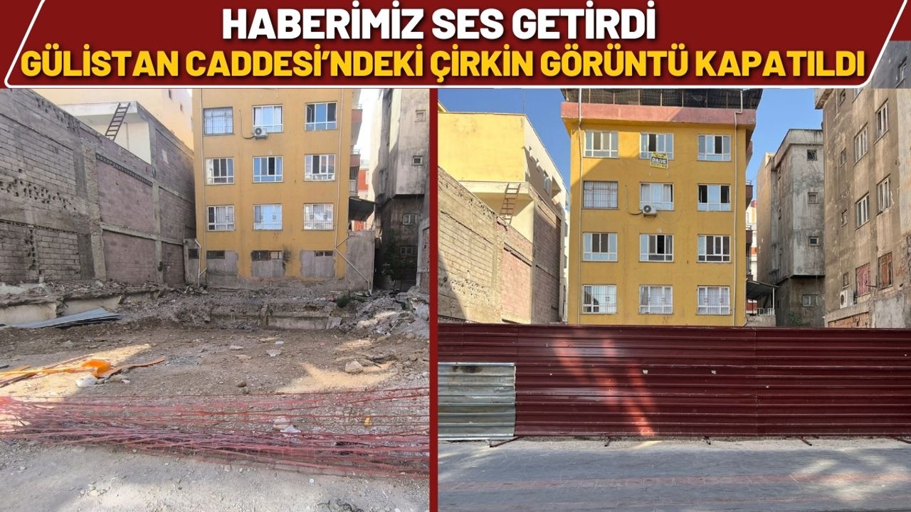 Batman’ın en işlek noktalarından biri olan Gülistan Caddesi’nde, yıkımı gerçekleştirilen binanın alanında oluşan görüntü kirliliği uzun süredir vatandaşların tepkisine yol açıyordu. Haberimizin ardından alanda çalışma yapılırken, çirkin görüntü metal panellerle kapatıldı.