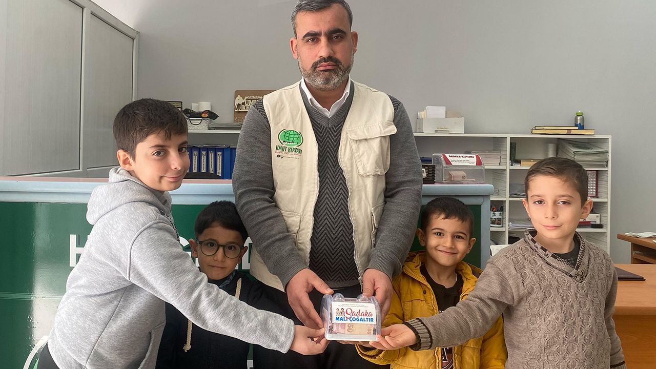 Parayı teslim alan Umut Kervanı gönüllüsü Rıdvan Üzümcü, çocukların