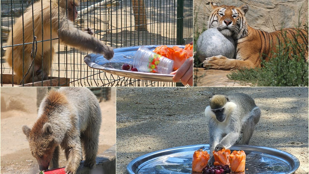 Hayvanat bahçesinin yönetim kurulu üyelerinden Özlem Ünal ise, “Buradaki canlılarımızı ilk önce kendi çocuğumuz gibi kendi insanımız düşünerek muamele etmeye çalışıyoruz. Canlılarımızın aynı zamanda beslenme saatleri var. Serinletmek için özellikle buzlu meyve ikramımız var. Meyve tepsileri hazırlarız. Et saatleri dışında soğuk meyvelerle canlılarımızı serinletmeye çalışıyoruz.” ifadelerini kullandı.
