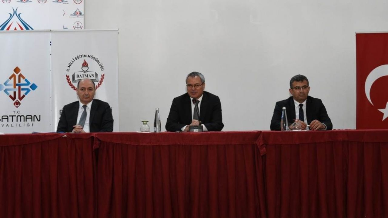 Fatıma Zehra Kız Anadolu İmam Hatip Lisesi Konferans salonunda düzenlenen toplantıya, Vali Deniz'in yanı sıra İl Milli Eğitim Müdürü Mahmut Kurtaran, il milli eğitim müdür yardımcıları ile okul müdürleri katıldı.