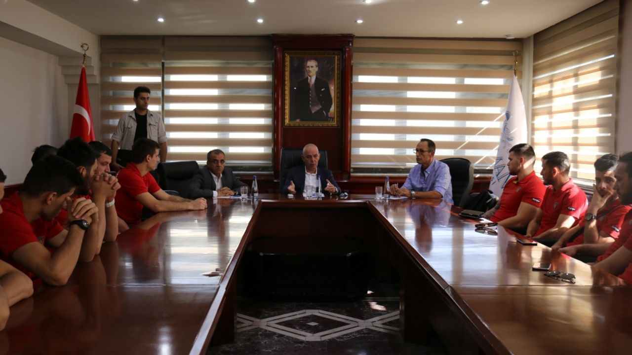 Başkan Vekili Aksoy, Süper Lige galibiyetle başlayan 1955 Batman Belediyespor Erkek Hentbol takımı teknik heyet ve oyuncularının Belediye Meclis Salonundaki kabulünde Belediye Başkan Yardımcısı ve Kulüp Başkanı Doç. Dr. H. Murat Şahin de hazır bulundu.