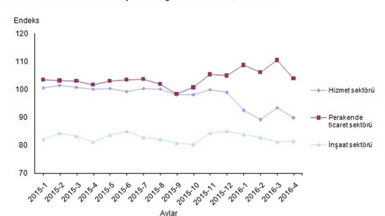 TÜİK'in Mart ayına ait verilerine göre, mevsim etkilerinden arındırılmış hizmet sektörü güven endeksi Mart ayında 93,50 iken, Nisan ayında 89,93 değerine düştü. Hizmet sektörü güven endeksindeki bu azalış; son üç aylık dönemde 'iş durumunun' iyileştiğini, 'hizmetlere olan talebin' arttığını değerlendiren ve gelecek üç aylık dönemde 'hizmetlere olan talebin' artacağını bekleyen girişim yöneticisi sayısının azalmasından kaynaklandı.Hizmet sektöründe bir önceki aya göre; iş durumu, hizmetlere olan talep ve hizmetlere olan talep beklentisi endeksleri sırasıyla yüzde 4,9, yüzde 2,1 ve yüzde 4,2 azaldı. Haber Merkezi