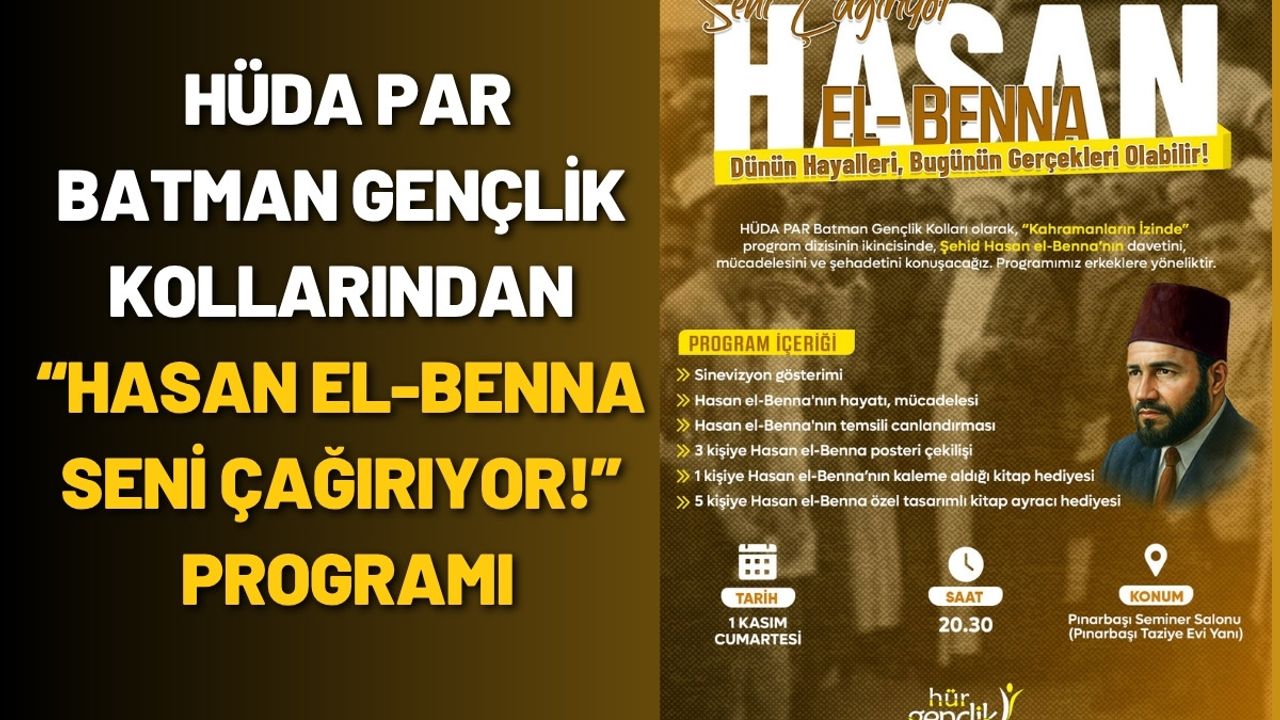 HÜDA PAR Batman Gençlik Kolları, “Kahramanların İzinde” program dizisinin ikincisinde, “Hasan El-Benna Seni Çağırıyor!” başlıklı özel bir buluşmaya imza atacak. Programda, İhvan-ı Müslimin hareketinin kurucusu olarak bilinen Şehid Hasan el-Benna’nın daveti, mücadelesi ve şehadeti ele alınacak.