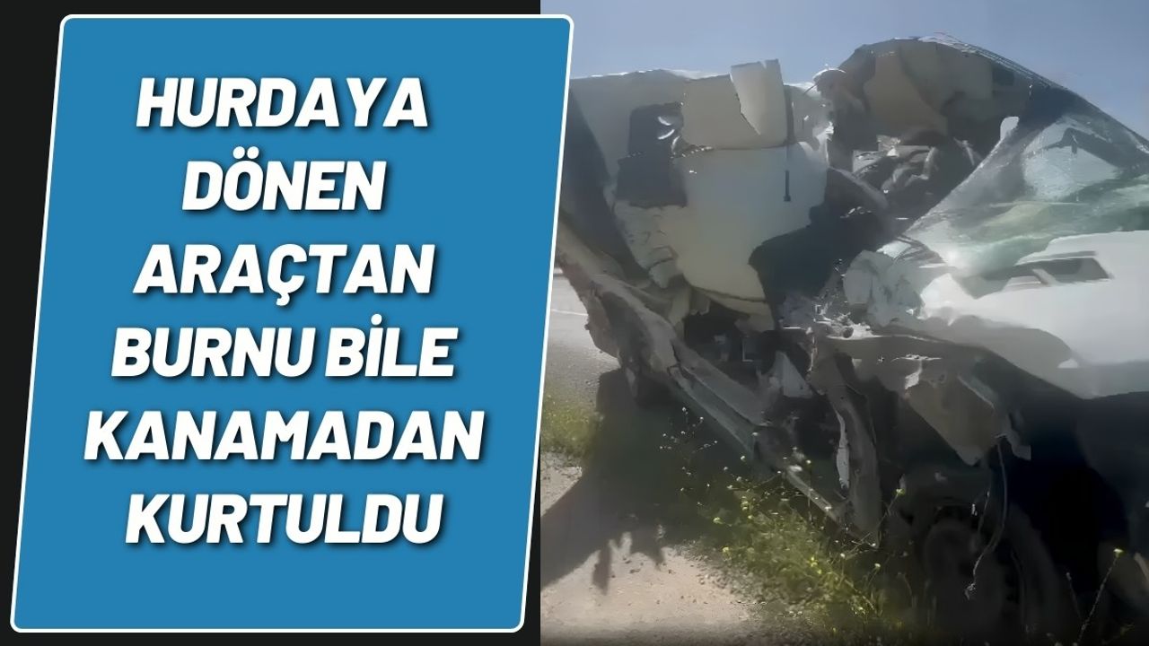 Çarpmanın etkisiyle transit araç tanınmaz hale gelirken, ön kısmı tamamen hurdaya döndü. Şiddetli çarpışma sonucu aracın ön kabini büyük hasar aldı ve olay yeri adeta bir enkaza dönüştü. Ancak kazanın en dikkat çekici yönü, sürücünün bu korkunç kazadan burnu bile kanamadan kurtulmuş olmasıydı.