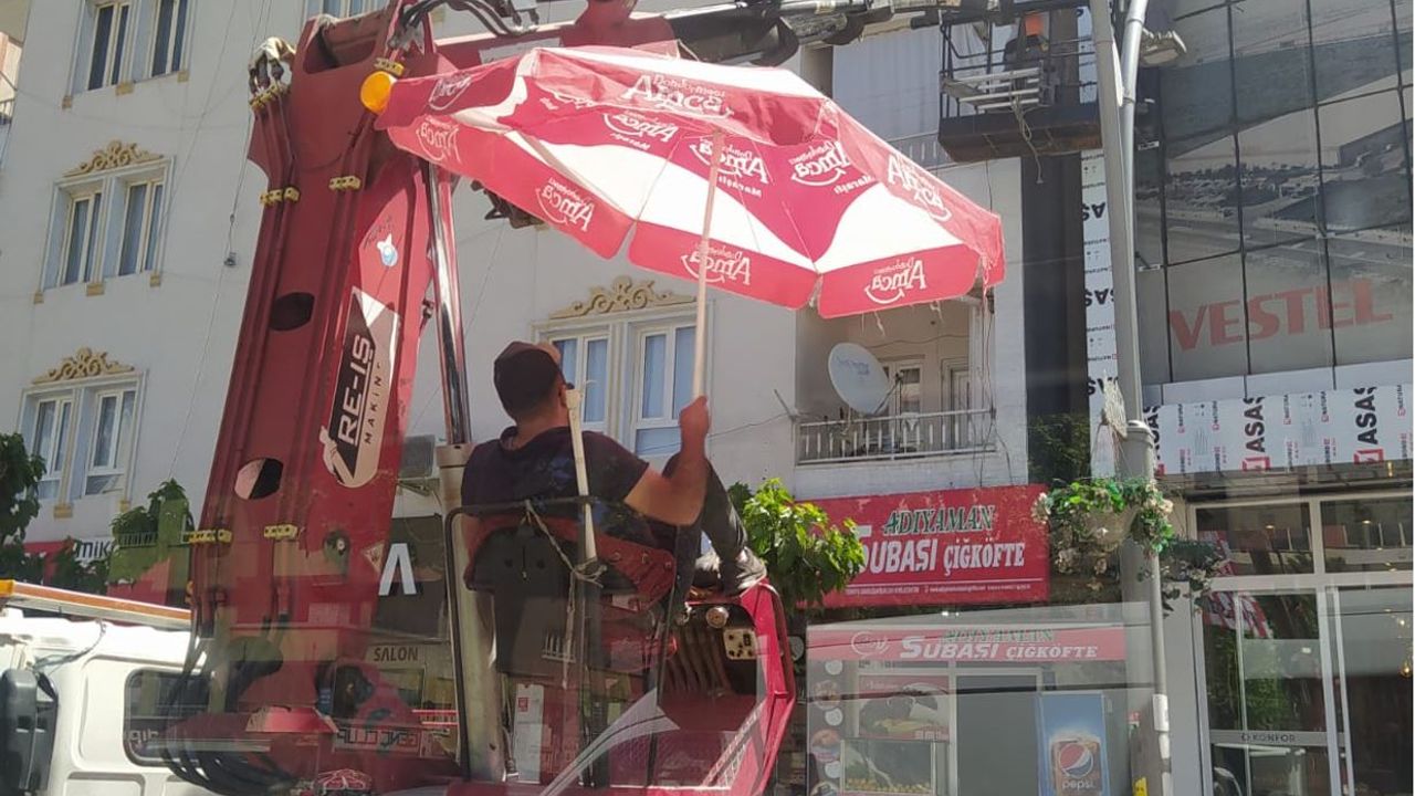 Dondurma şemsiyeli vinç operatörünü gören vatandaşlar manzaraya ilgiyle bakıp