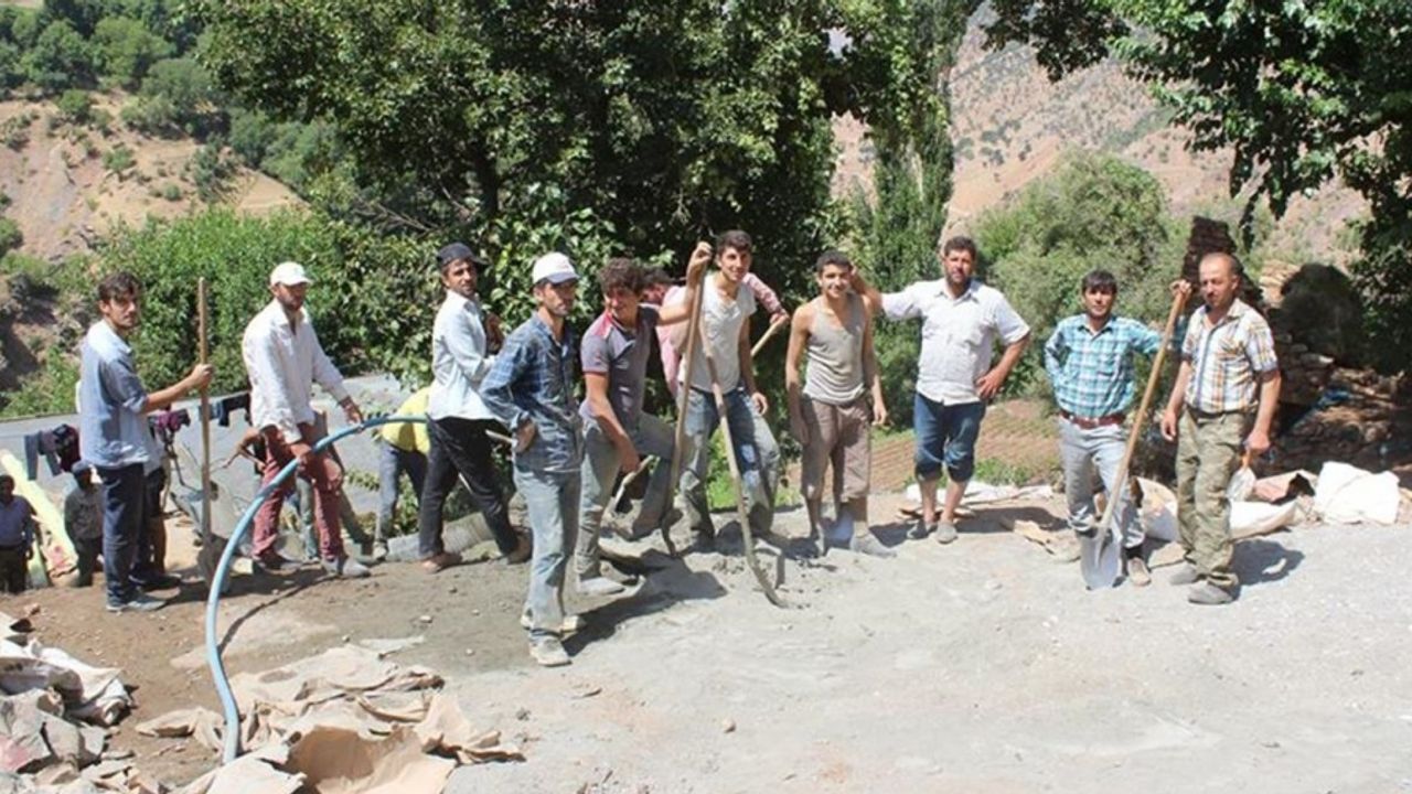Sason ilçesinde toprak olan evinin damını beton yapmak isteyen vatandaş evinin dağın eteğinde olması nedeniyle çaresiz kalınca, vatandaşın imdadına yetişen 3 köyden yaklaşık 50 kişi, işi bir günde bitirdi.