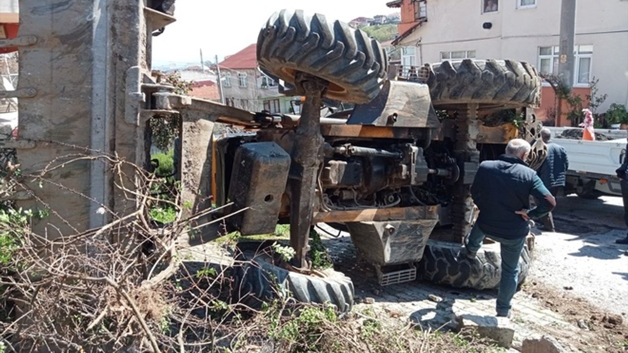 Donanma Mahallesi'nde operatör İlkay B. idaresindeki iş makinesi, freninin boşalması nedeniyle bir evin bahçesine devrildi.