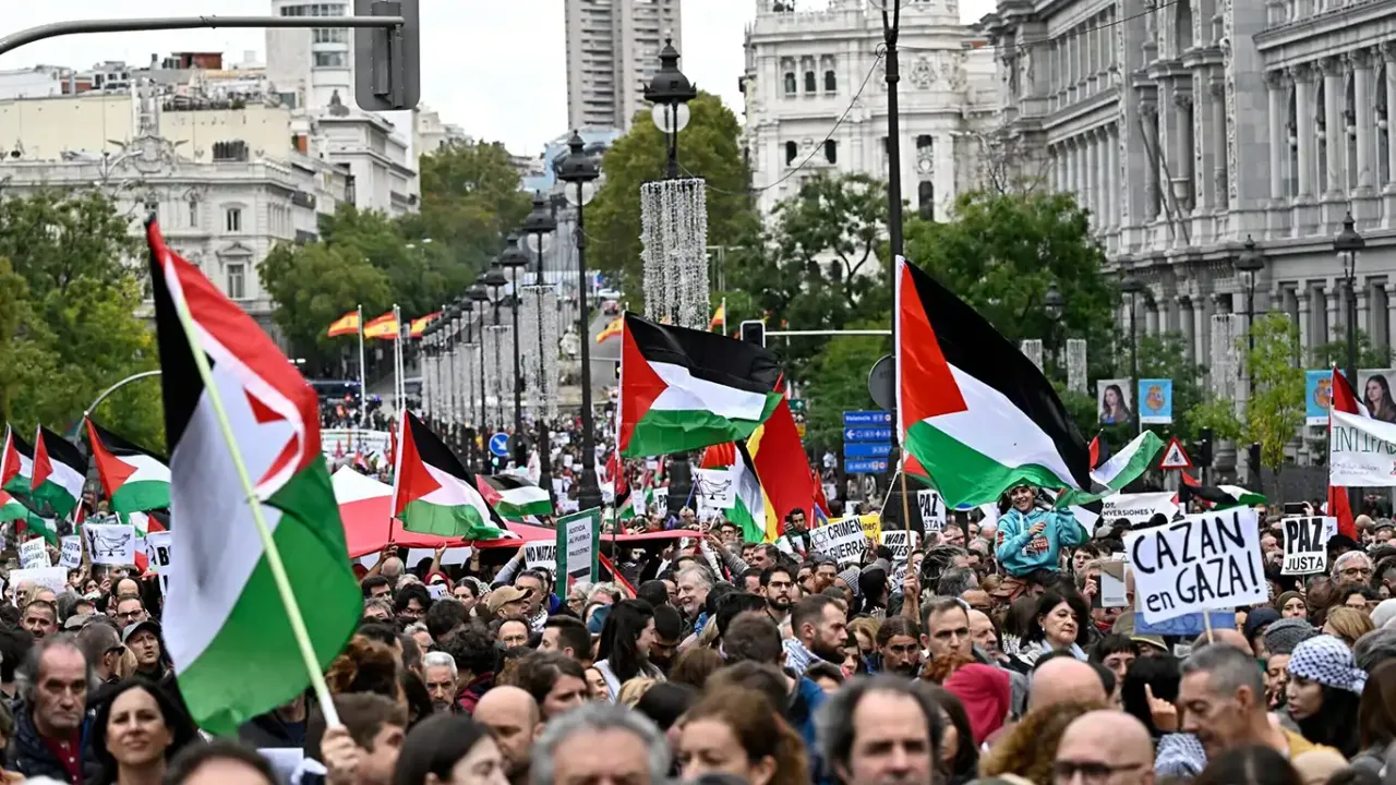 "Madrid Filistin ile Üniter Asamblesi" adlı örgütün çağrısıyla, "Her zaman Filistin direnişiyle" başlığı altında kent merkezinde yapılan yürüyüşte, "İsrail'e boykot", "Bu bir savaş değil, soykırım", "Katil Netahyahu", "Özgür Filistin", "Adalet", "İsrail vuruyor, ABD ve AB sponsorluk yapıyor" sloganları attı.