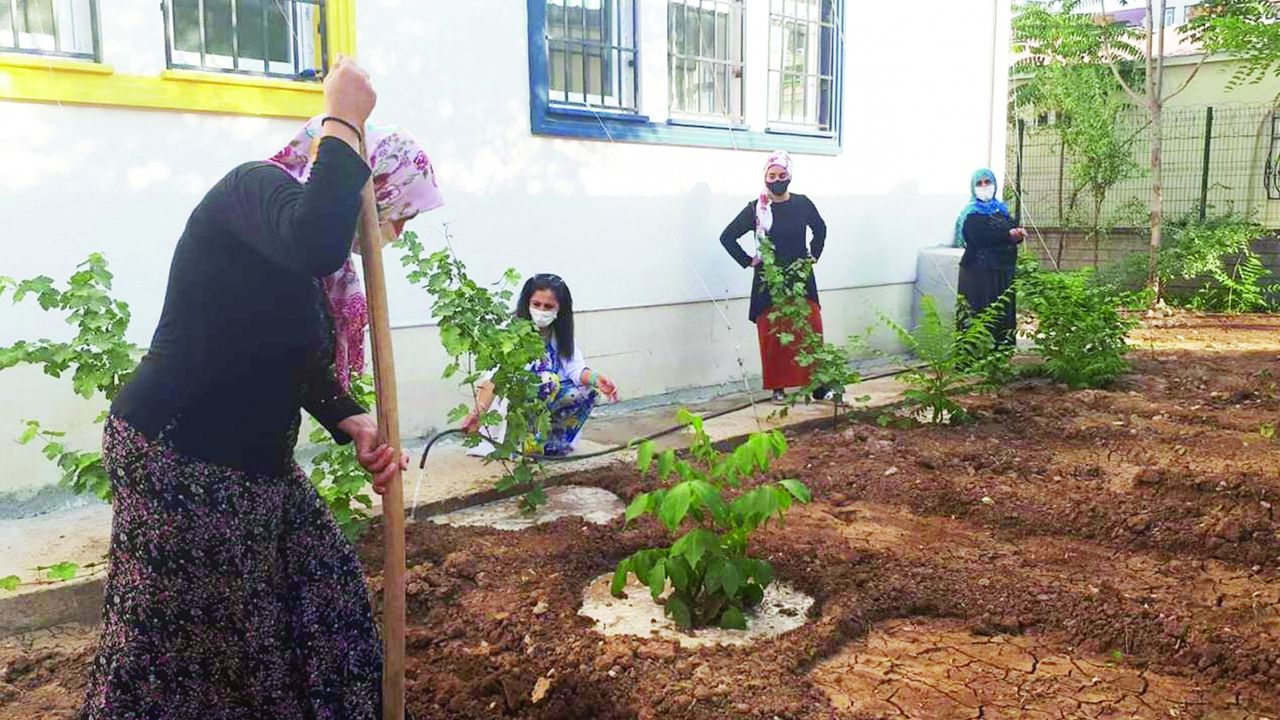 saksılarda yetiştiriyor. Bahçe kursuna gelen kadınlar sosyal mesafeye uyarak ve