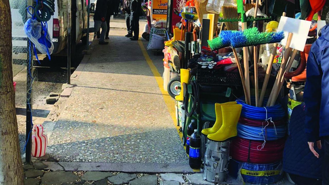 esnafın kaldırım kullanım alanını belirlemek için kaldırımlarda sarı çizgi