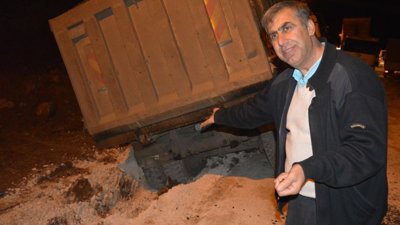 Altyapı çalışması için boru döşemelerinden sonra gereği gibi bastırılmayıp kapatılmayan yolda çöken kamyon yolu bir süre trafiğe kapattı.