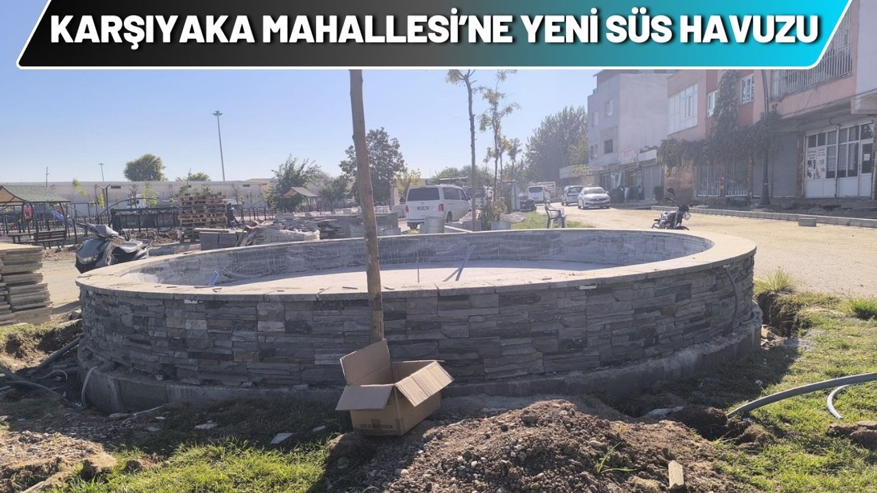 Taş kaplama malzemelerle inşa edilen süs havuzu, modern mimarisiyle dikkat çekiyor. Proje tamamlandığında Karşıyaka Mahallesi, hem ulaşım açısından daha düzenli bir caddeye sahip olacak hem de mahalle girişinde estetik bir görünüme kavuşacak.
