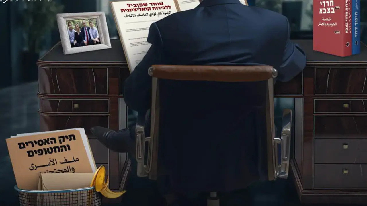Görüntüde ayak ayak üstüne atmış halde bir masaya sırtı dönük vaziyette oturan işgal rejimi yöneticisi Netenyahu'nun elindeki dosyada "Hükümet koalisyonunun bütünlüğünü oluşturmak için rüşvet" yazarken masada da "dini eğitim" ve "Orduda Haredi hizmeti" yazılı dosyalar yer aldı.