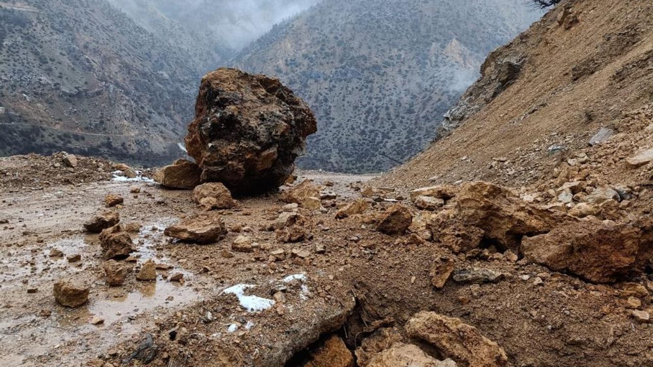 kopan kaya parçaları köyü yolunu ulaşıma kapattı.