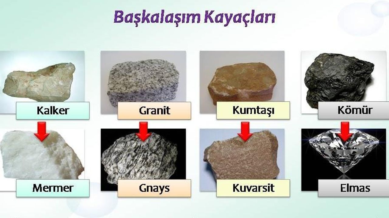 Bazen, magmatik veya tortul kayaçlar, yerin derinliklerinde çok büyük ısıya ve basınca maruz kalırlar. Tıpkı hamurun fırında pişince bambaşka bir şeye dönüşmesi gibi, bu yüksek ısı ve basınç altında kayaçların yapısı değişir ve bambaşka bir kayaç haline gelirler. Buna başkalaşım denir.