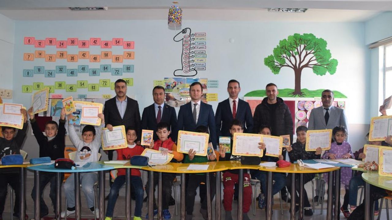 dağıtan Kaymakam Güngör, karne alan öğrencileri tebrik etti. Güngör, çocuklarla