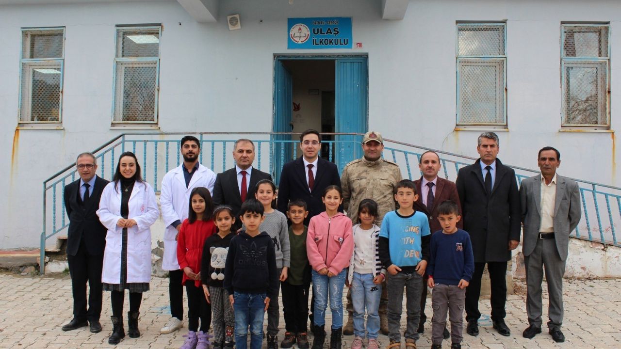 Ulaş Köyü muhtarı M. Nuri Güneş tarafından karşılanan kaymakam Öztaş, Ulaş Köy Okulunu ziyaret ederek öğrenciler ile sohbet etti.