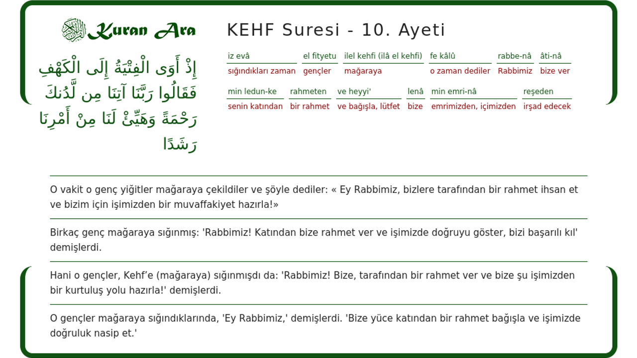 Türkçe Anlamı: O (imanlı) gençler mağaraya sığındıklarında şöyle demişlerdi: "Ey Rabbimiz! Bize katından bir rahmet ver ve içinde bulunduğumuz şu durumda bize kurtuluş ve doğruluğa ulaşmayı kolaylaştır."